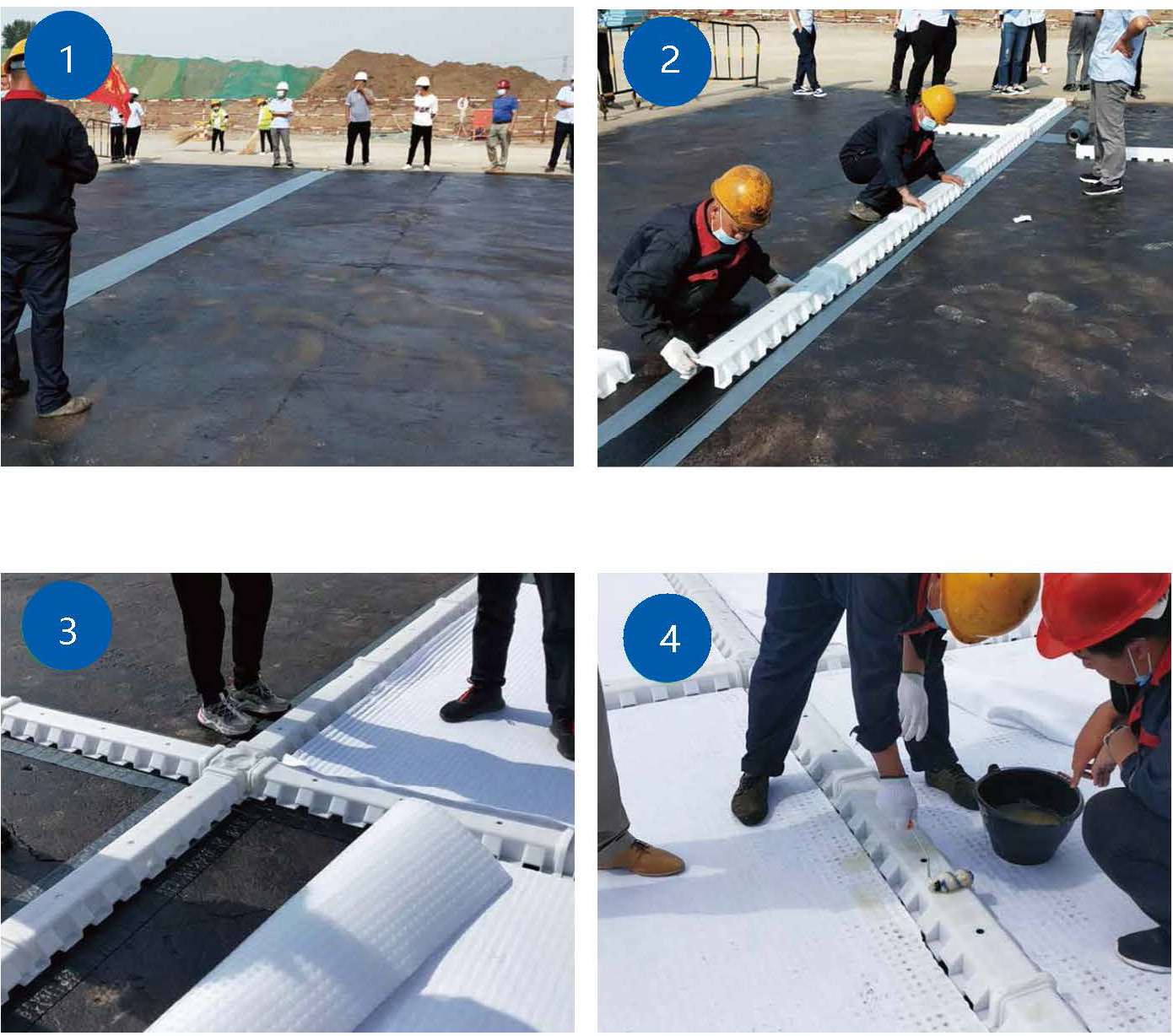 基層驗收——規劃彈線———鋪設CKF500自粘卷材—―鋪設虹吸排水槽——鋪設高分子防護異型片——安裝虹吸透氣觀察管(安裝沉淀觀察井)——接入雨水收集系統——自檢驗收——檢查驗收。