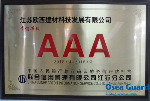 2015年4月,江蘇歐西建材科技發展有限公司和江蘇歐西建設工程有限公司被中國人民銀行總行行確認的資信評估機構—聯合信用管理有限公司江蘇分公司評為AAA等級。