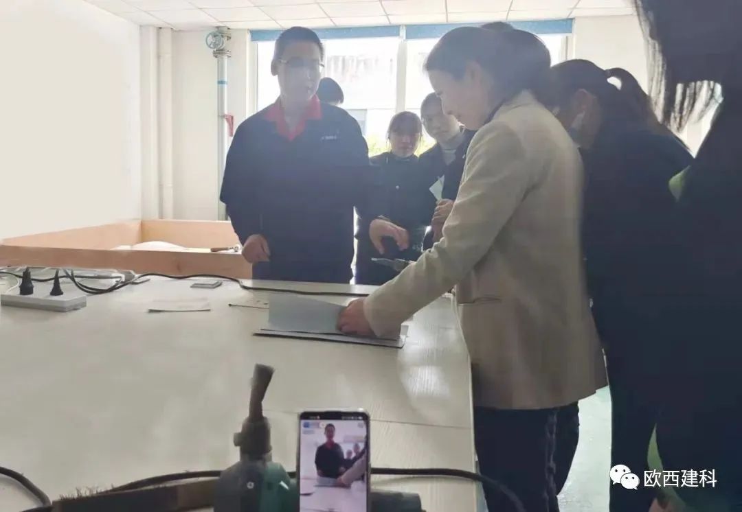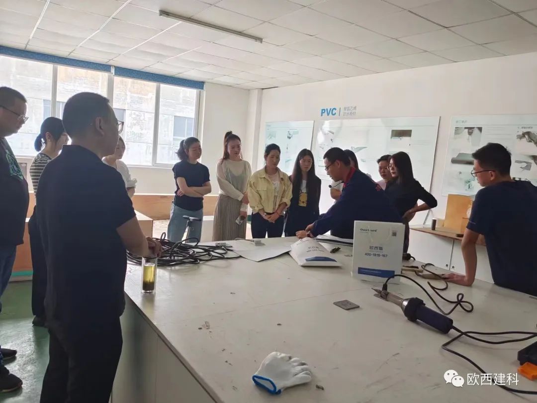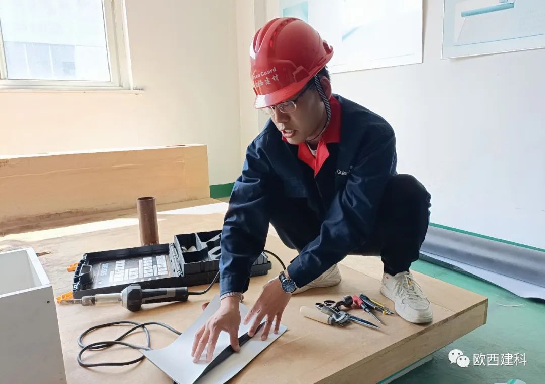 于經理采取理論貫穿實操的教授方法,對歐西盾TPO防水卷材、LOCA預鋪反粘防水卷材作業標準化作業、安全標準化、質量標準化等內容進行了系統講解,現場模擬實操正確流程及安全注意事項,并結合實操演練對施工注意事項、焊槍及爬行焊機使用規范等內容展開了培訓等營銷人員通過接受專業實操訓練,使大家更加直觀的感受到防水卷材在施工中的一些細節,如陰陽角、管道、通風口及樁頭的做法,有效提高了大家的防水專業技能知知識。