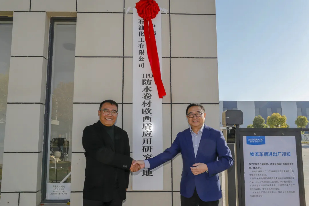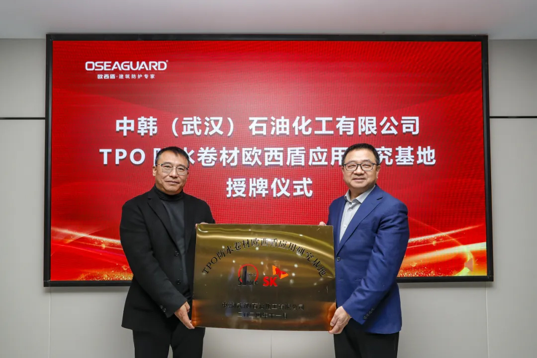 中韓(武漢)石油化工有限公司黨委書記、董事長、總經理劉百強為歐西盾TPO防水卷材應用研發基地授牌,至此,雙方合作邁入嶄新階段,將共同致力于推動中韓石化超軟聚丙烯在TPO防水卷材領域的技術革新與應用拓展。